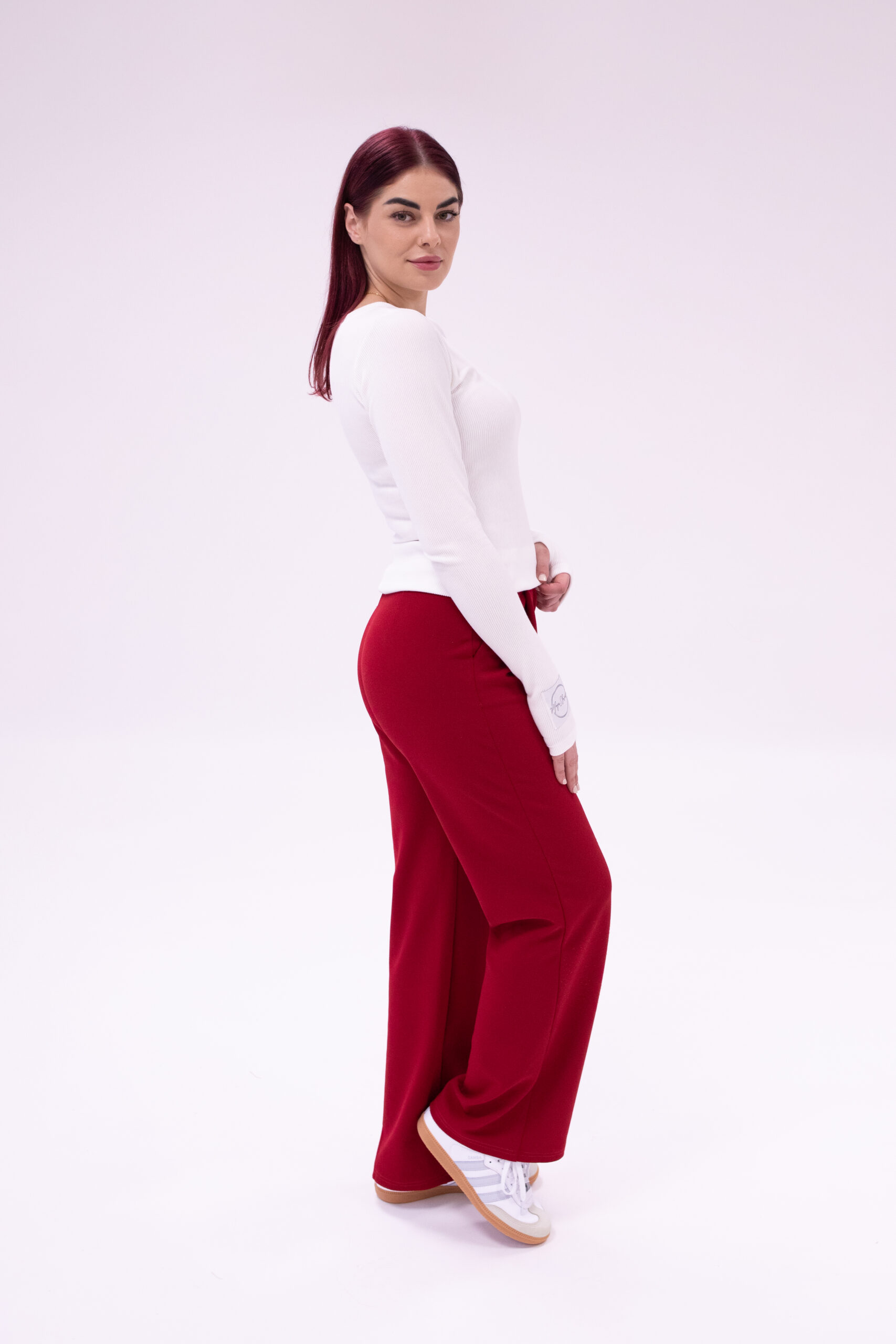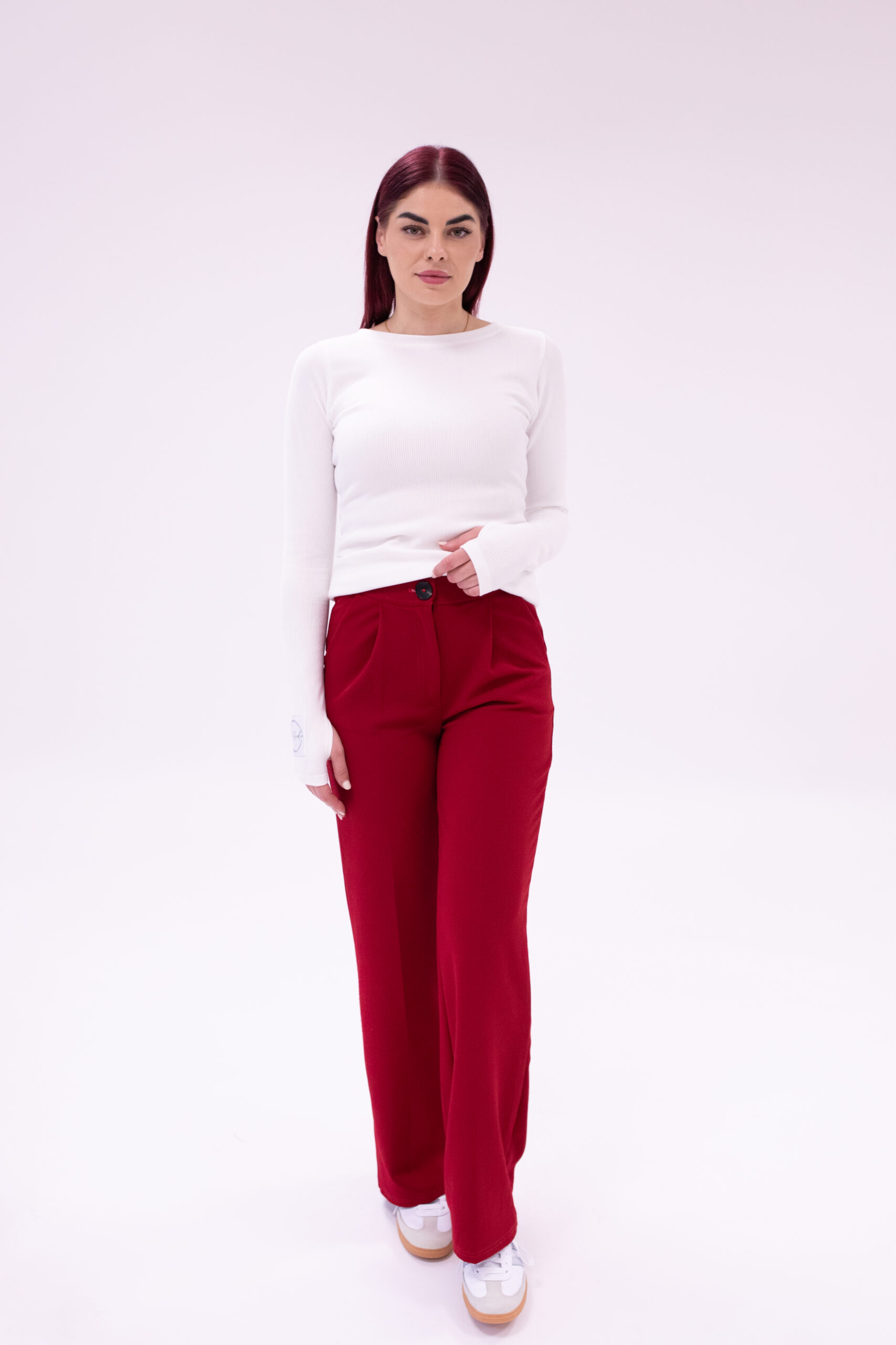 Sú ušité z nekrčivého scuba materiálu v pristanlivom strihu so zvýšeným pásom. Doplnené sú praktickými prednými vreckami a prešívaním, ktoré sa hodí, ako k elegantným, tak aj športovým outfitom.
